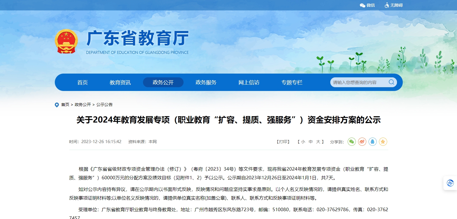 根據《廣東省省級財政專(zhuān)項資金管理辦法(修訂)》(粵府〔2023〕34號)等文件要求,現將我省2024年教育發(fā)展專(zhuān)項資金(職業(yè)教育“擴容、提質(zhì)、強服務(wù)”)60000萬(wàn)元的分配方案及績(jì)效目標(見(jiàn)附件1、2)予以公示。公示期自2023年12月26日至2024年1月1日,共7天。